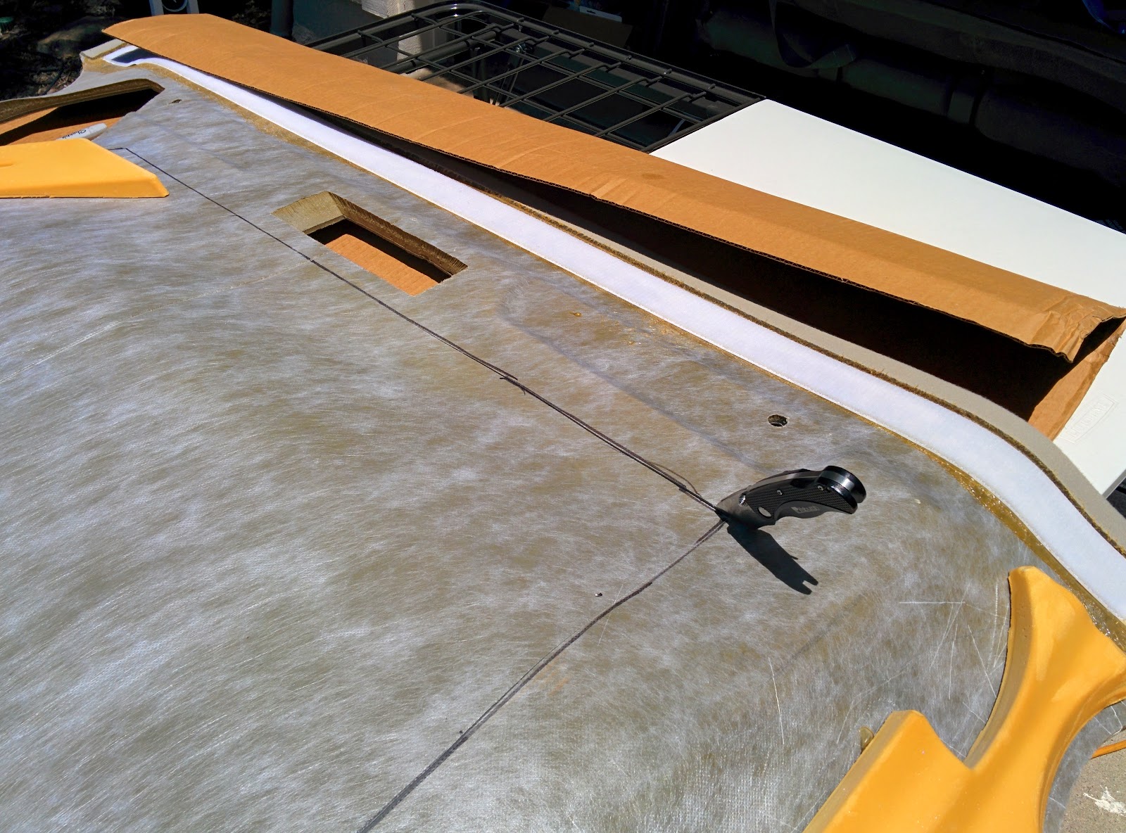 Given how thin the "side strips" are, and due to issues with needing to fit around the reinforcing ring at the forward edge, I decided to divide the headliner into two pieces. I needed to make a new forward section from scratch. The "middle" and rear headliners are now currently installed, but the cut edges still show. I didn't like how the old GTRV headliner was installed as one giant piece with the fabric from the headliner wrapped directly onto the upper roof and was glued down. This made it so you couldn't drop the headliner without peeling the glue, so I'm making sure I "fix" that method before I recover everything here.